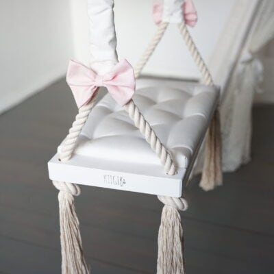 The Cloudcatcher is made from durable pine wood, high load capacity soft cotton rope and Oeko-Tex Standard 100 canvas cotton fabric. The wooden part is finished with natural and non-toxic Vintro chalk paint. The steel rings attached to the ropes are stainless.